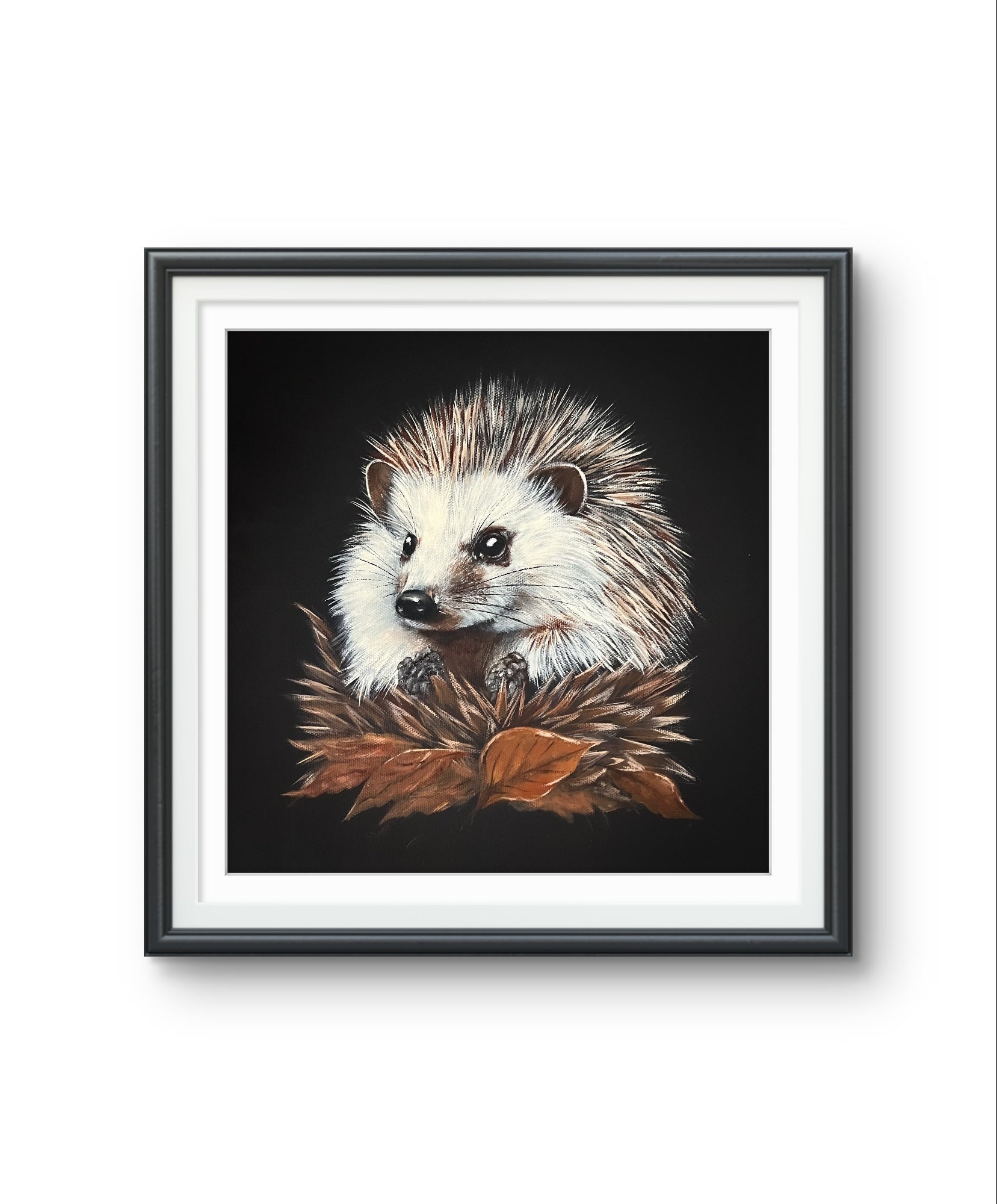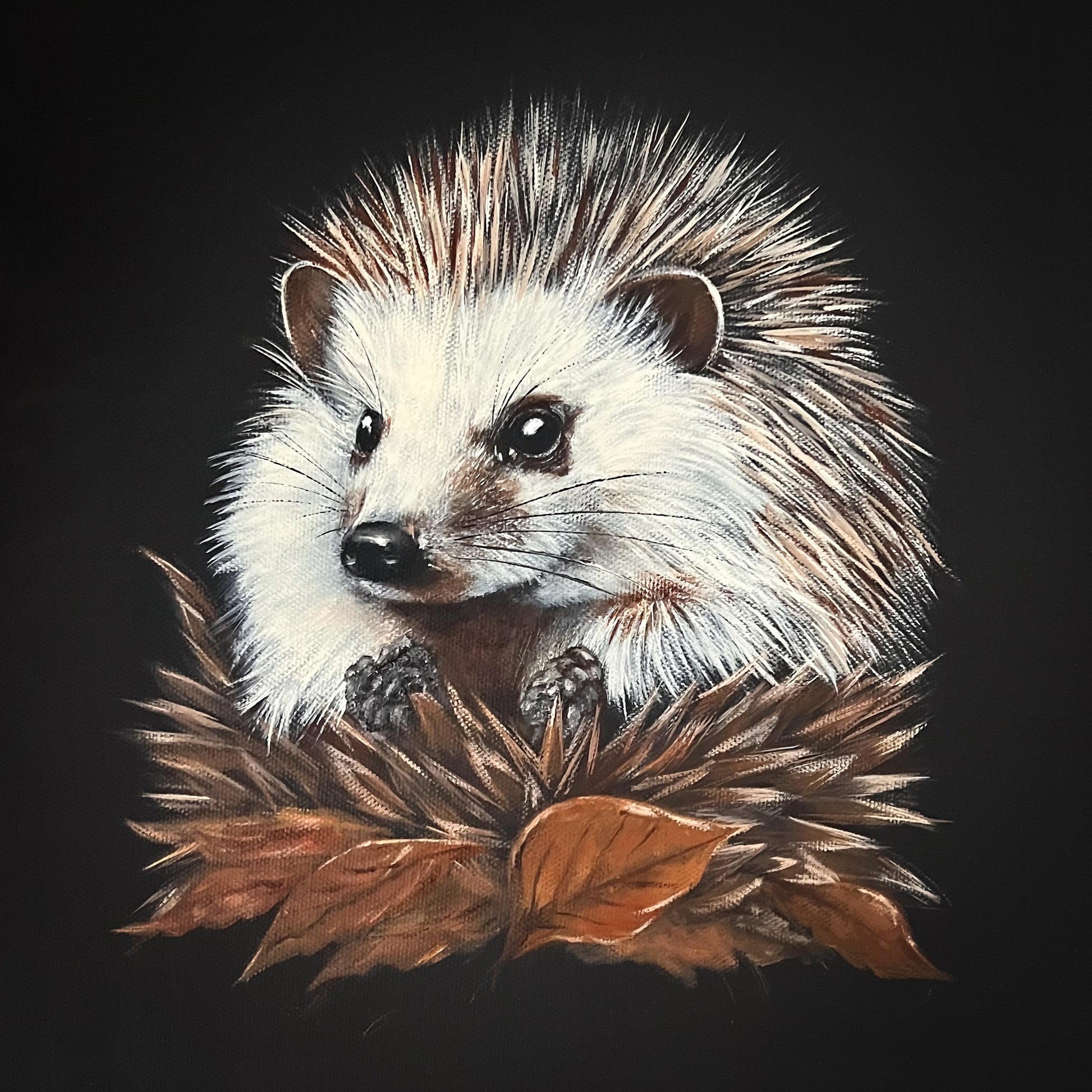 Mysterious yet endearing, The Nightwatcher captures the quiet presence of a hedgehog beneath the moonlit sky. With striking detail and lifelike texture, this artwork highlights the animal’s watchful gaze as it nestles among autumn leaves.